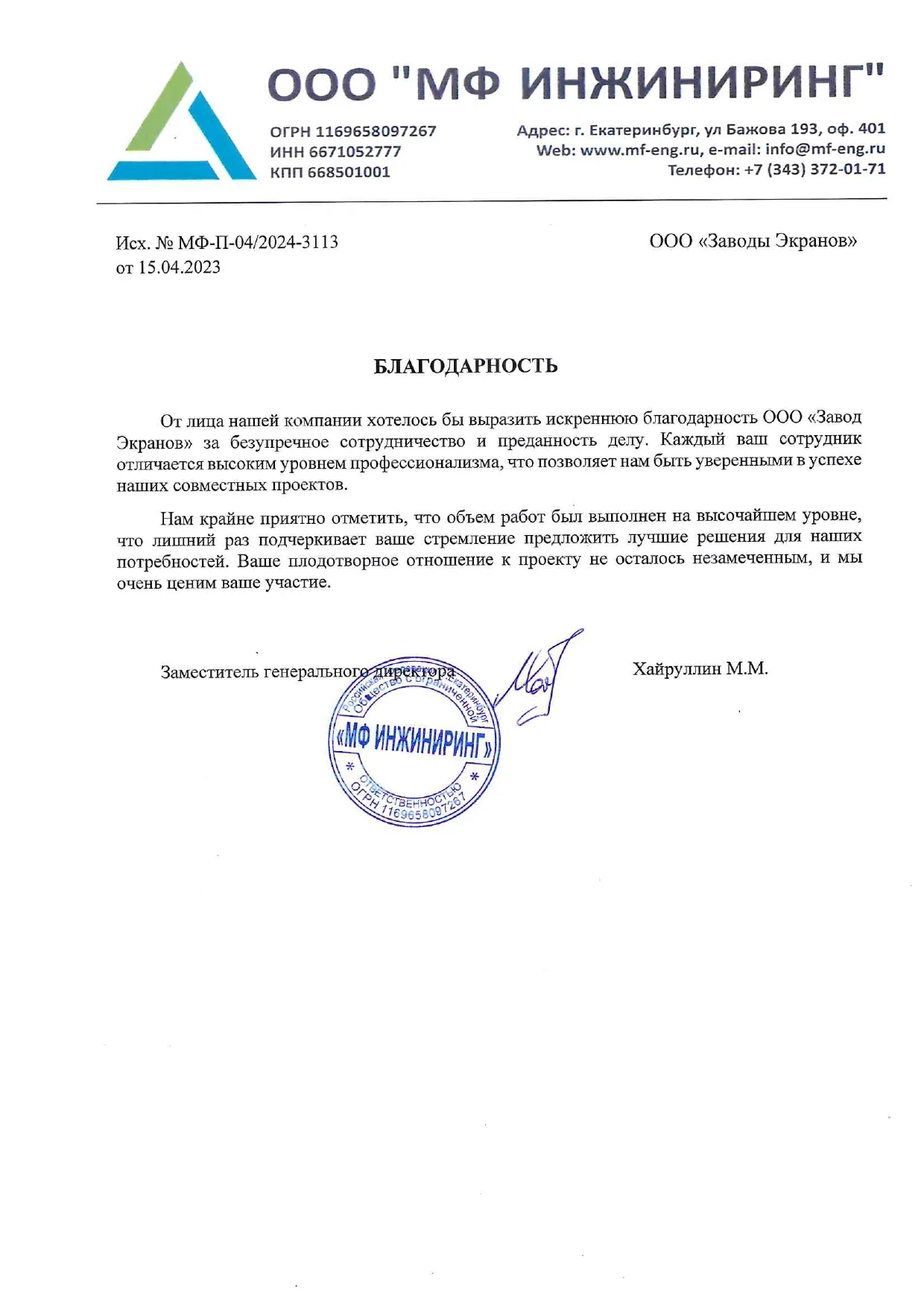 От лица нашей компании хотелось бы выразить искреннюю благодарность ООО «Завод Экранов» за безупречное сотрудничество и преданность делу. Каждый ваш сотрудник отличается высоким уровнем профессионализма, что позволяет нам быть уверенными в успехе наших совместных проектов.